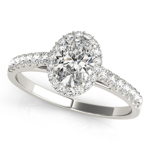 This stunning Halo Oval engagement ring design features 32 sparkling Natural Diamonds surrounding the Oval 7X5 Lab Grown diamond at the center. Set in 14k White Gold. |